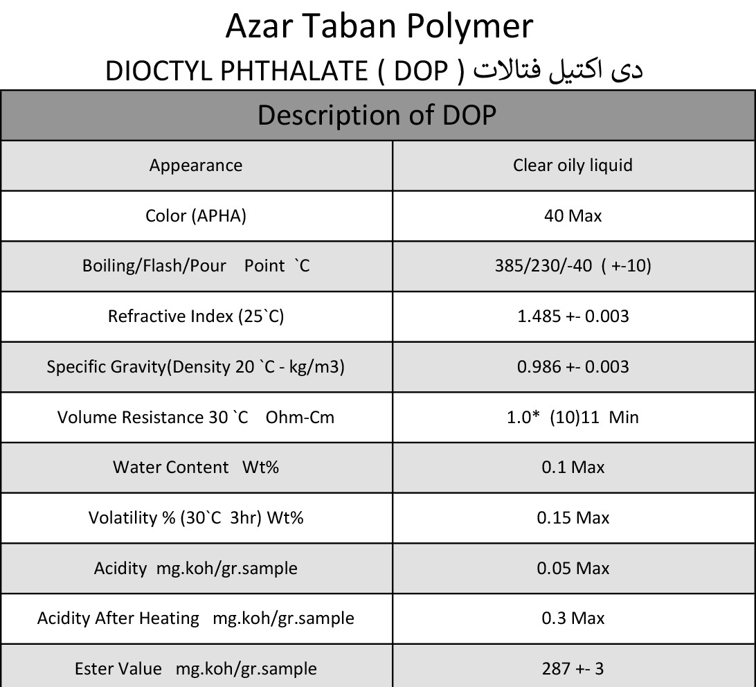 دی اکتیل فتالات (DOP) یک ترکیب شیمیایی پرکاربرد در صنایع شیمیایی است که بیشتر به عنوان یک نرم کننده استفاده می شود. این ترکیب شیمیایی به صورت یک مایع شفاف و بی رنگ با بوی ملایم اما مشخص در بازار به فروش می رسد. این ماده با اکثر حلال های آلی قابل اختلاط است اما در آب محلول نیست.